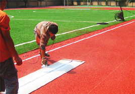BSJX0451 white paint, according to the design size of spraying sports line, ensure the line width consistent, uniform color, no false edge.