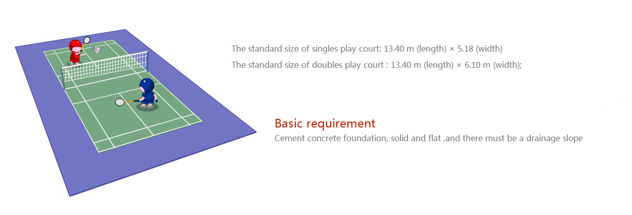The standard size of singles play court: 13.40 m (length) × 5.18 (width)