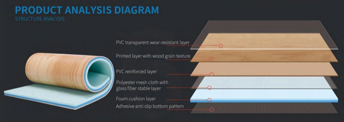 The wear-resistant layer can reach a thickness of up to 1.5mm, and the product is equipped with a stable layer made of glass fiber non-woven fabric and high-density polyester mesh cloth. The glass fiber cloth is coated with polyester woven fabric to effectively prevent floor shrinkage and extend the service life of the floor.