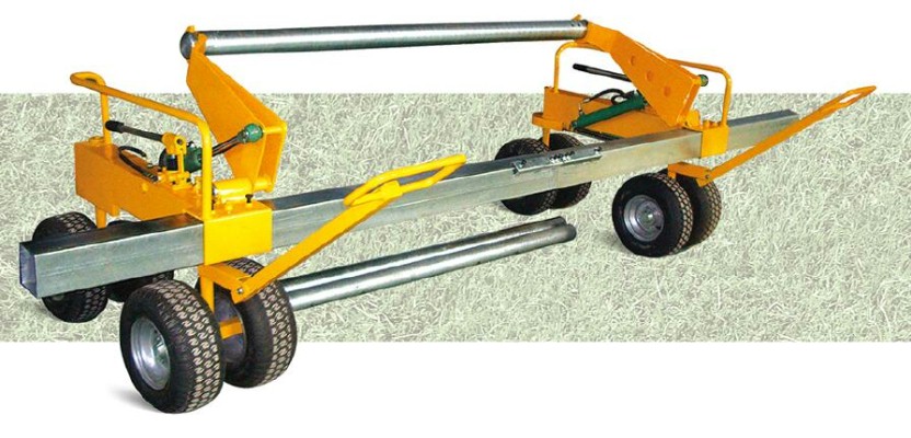The machine is specialized cart in transport and installation for artificial turf, it allows the laying of artificial turf reels up to 5m width. The operation of machine consists of 2 carts to work together (direction changing, transportation, up and down). Each cart is provided with two steerable double tyres which can be turned synchronously via drawbar and tie bar; A square crossbeam connects both carts. 4 pairs of wheels take the total weight at the same time so as to ensure the minimum of surface pressure. Meanwhile, it can transport the turf very easily. Both carts are equipped with a hydraulically actuated lifting device a hand pump and hydraulic cylinder, which make it easily lifting and lowering of the artificial turf.
