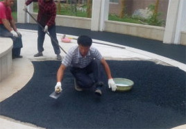 Before laying the black granules, firstly coating a layer of glue, put the Pu environment-friendly adhesive with environmental black granule materials before the glue doesn’t get cured. According to the proportion of mixing evenly, pour on the ground, use specialized paving machine to level compaction, to control the amount and thickness; uneven place should continue to be leveled.