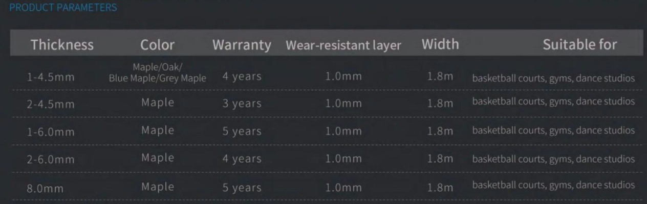 The wear-resistant layer is made of 100% pure PVC high-quality raw materials, fundamentally ensuring the stability of various performance parameters of the product. The wear-resistant layer of the product maintains the best level of performance in terms of rebound rate, friction coefficient, energy return, vibration absorption, etc.