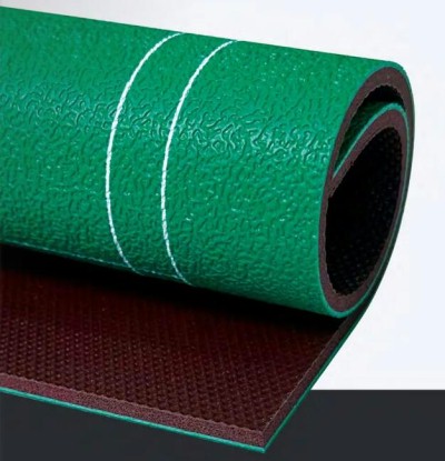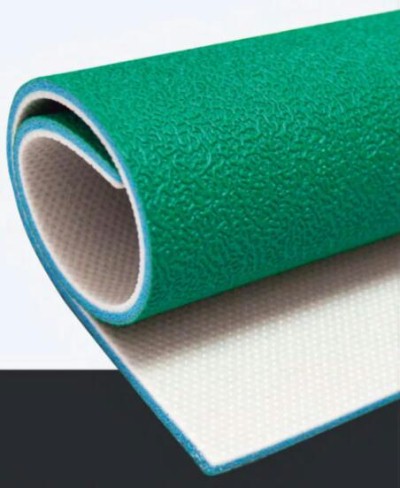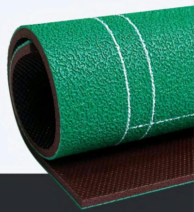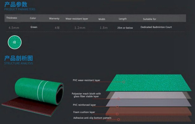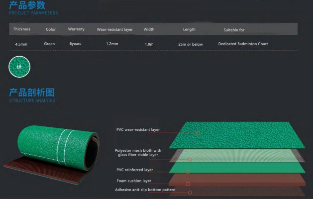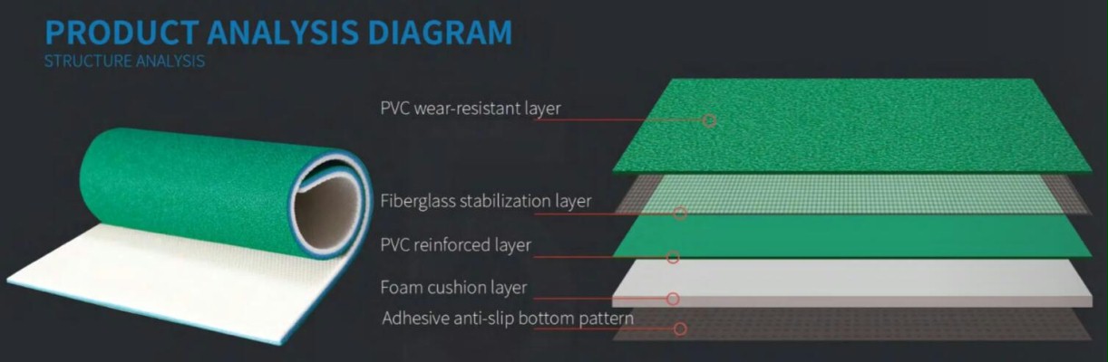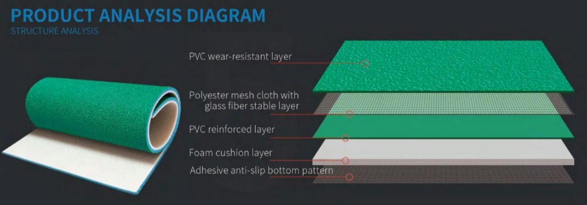 The wear-resistant layer made of 100% pure PVC extends the service life of the product. The surface layer is sandwiched with fiberglass non-woven fabric and bidirectional polyester mesh fabric. In the selection of foam layer materials, high-strength and high-density foam layer is selected, which has good vibration absorption function, allowing the impulse generated during exercise to act on the surface of the adhesive, with the ability to absorb impact energy, thereby protecting the ankle joints, spinal cord and brain of athletes, and avoiding sports injuries.