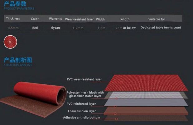 Weaving Series sports flooring is specially designed flooring for table tennis, with red Weaving Series embedded with fiberglass non-woven fabric. It is a cost-effective product launched by the company for the mass consumer market, suitable for professional table tennis sports venues.